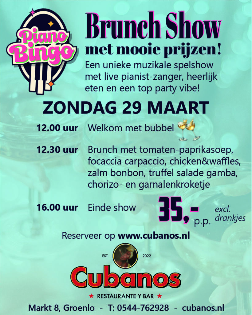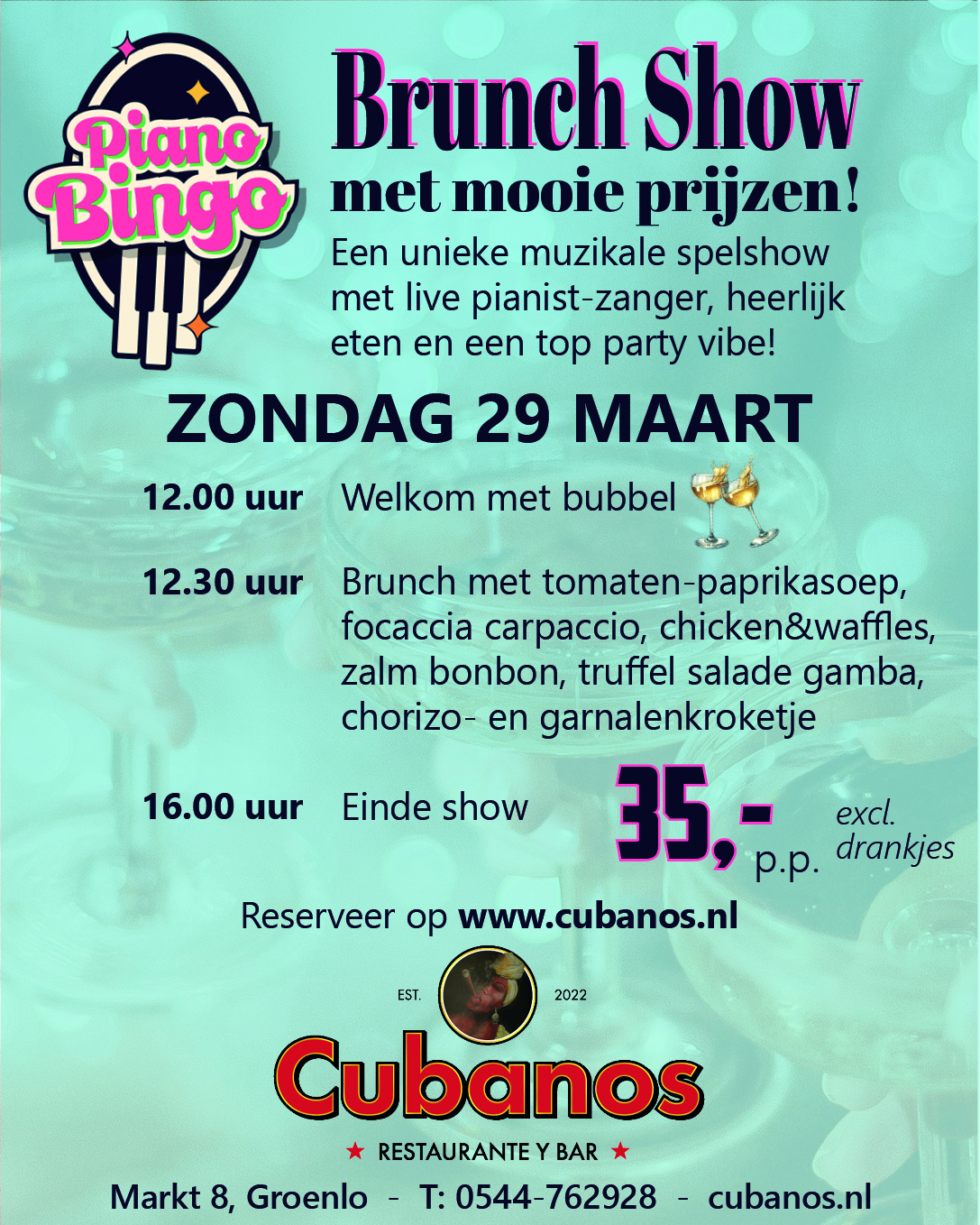 Op zondag 29 maart staat Cubanos in het teken van muziek, gezelligheid en een brunch om van te watertanden. Tijdens onze Piano Bingo Brunch Show geniet je van een unieke muzikale spelshow met live pianist-zanger, mooie prijzen en een heerlijke party vibe.